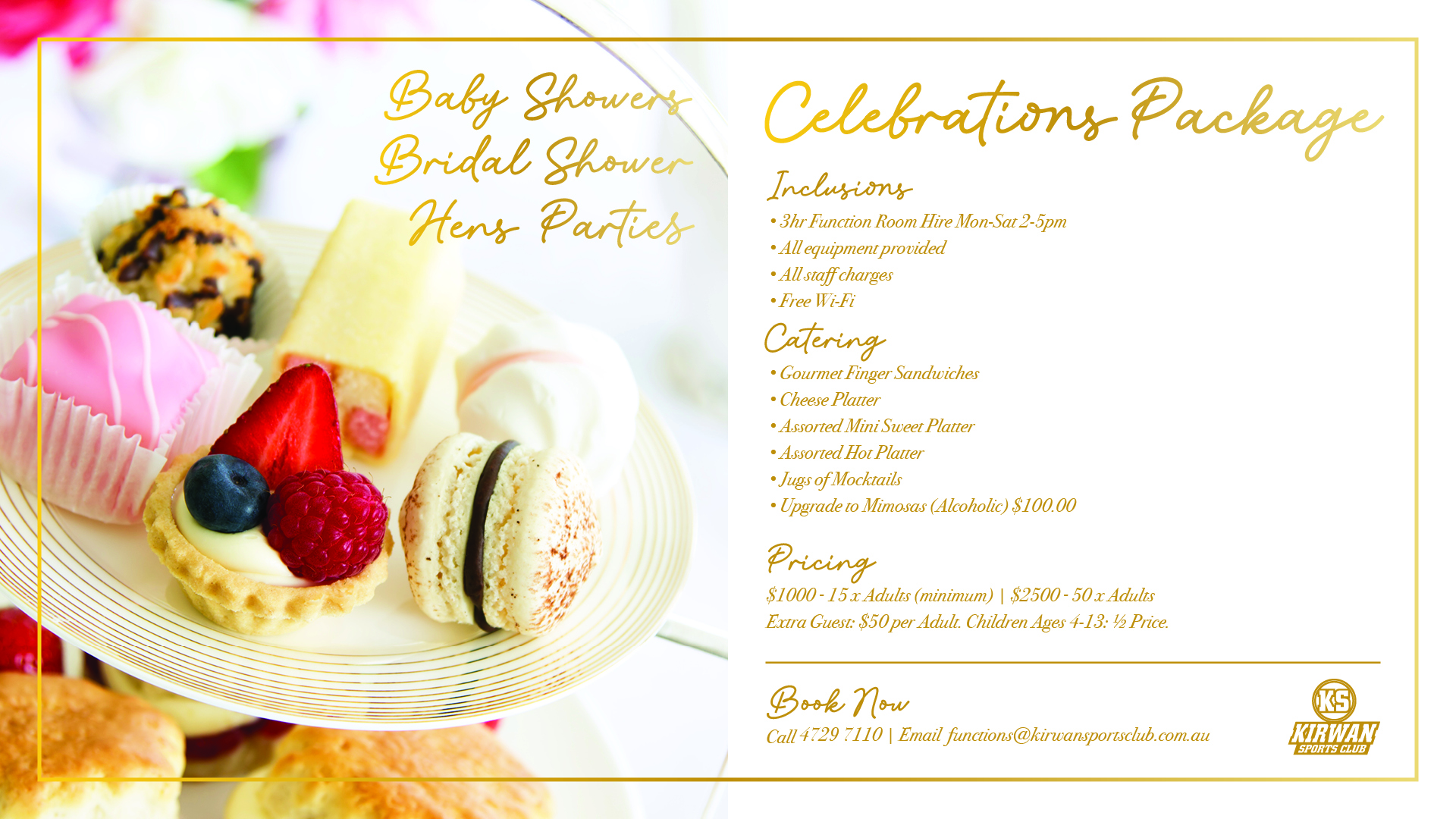 Kirwan Sports Club is located in the heart of Kirwan and only 15 minutes from the CBD and Townsville Airport. We are an ideal venue for your next social engagement, team bonding exercise or formal occasion. Our professional team can tailor a package to suit your unique event needs. Contact our Functions Coordinator today to get a package tailored to suit your next event.